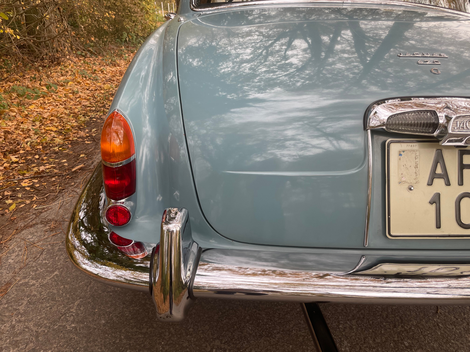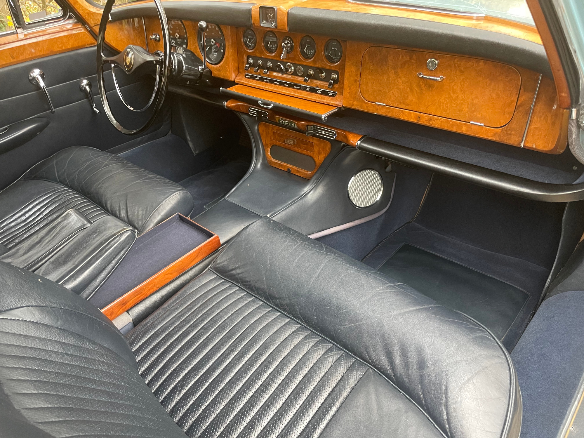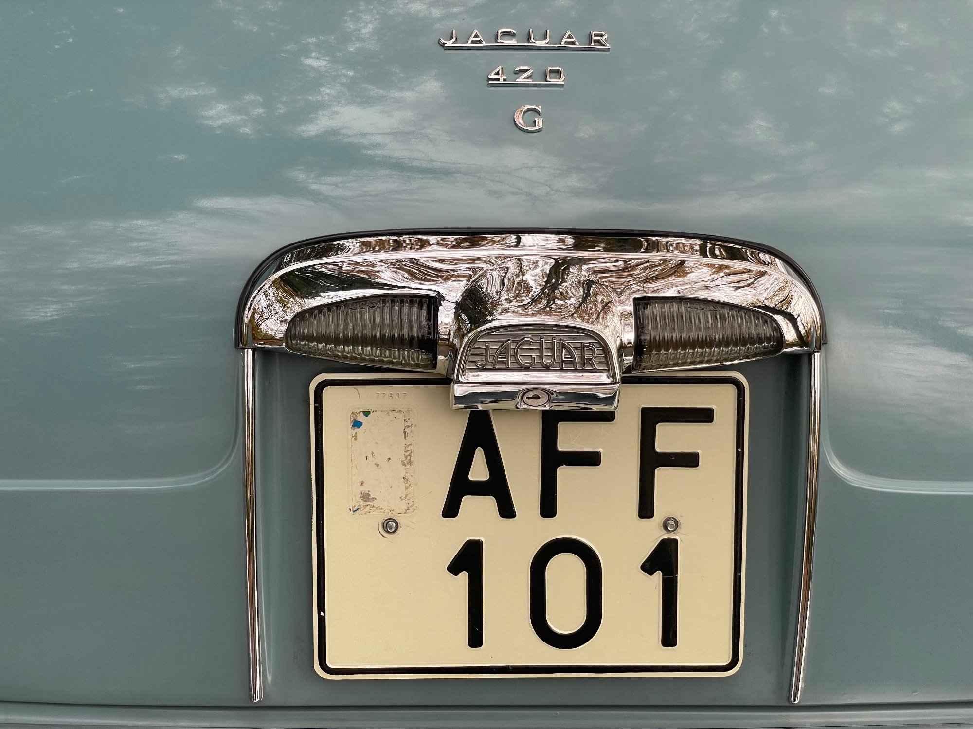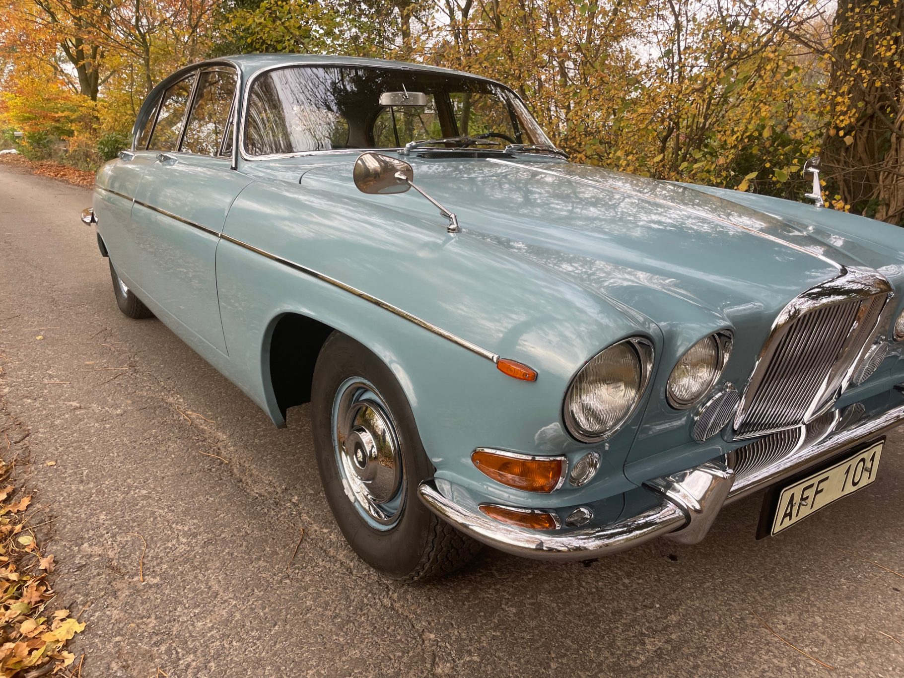The first called Mark X was the final model in the era of the 'Big Jaguars' built from 1962 till 1970. In 1965 it was batched newly 420G also called the 'Big Gee' ... even its still a miracle what the 'G' is really standing for: Great or Grand or Georgious? Browns Lane never had an answer on this question. In 2007-2008 we searched nearly two years and watched up to twentyfive MK-X/420G to find 'the only one' and I felt instantly in love with this highly authentic and original example. My lefthand-drive Jaguar is a late production of 1969 with first registration in Stockholm Sweden. Quiet overall in its first layer of paint (just the rear door left not). The rare solid colour 'Light Blue' shows a unique and charming wear of age. Same with the rich leather interior, carpets, ceiling, wooden dashboard etc. Each detail as it came out of Browns Lane factory in 1969; including a non-assembled leaping cat on the bonnet. For me a very rare detail! By the way ... all specificatios are ´matching numbers´ as date of delivery.
